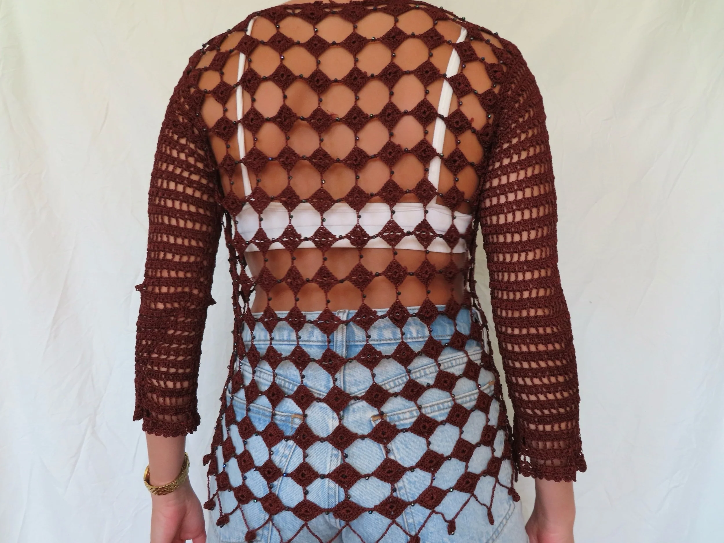 AMERICAN VINTAGE BROWN BEADED KNIT PEEP HOLE BLOUSE LONG SLEEVE TOP SIZE MEDIUM